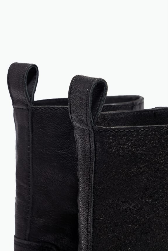 حذاء رعاة البقر من الجلد باللون الأسود. عارضة مع كعب مدبب وسحب للخلف. بطانة من الجلد مع نعل داخلي بشعار ونعل مخصص.