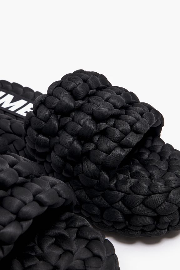 صندل مسطح باللون الأسود مع حزام أنبوبي مضفر يدويًا. نمط منزلق ، ملصق مخصص على النعل الداخلي ونعل الشعار.