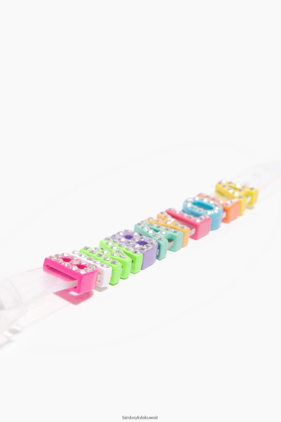 سوار بحزام شفاف وأحرف معدنية مطلية بالورنيش وكريستال متعدد الألوان. موديل قابل للتعديل مع شعار على المشبك.