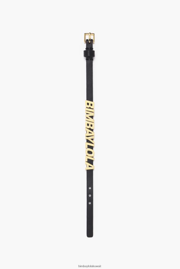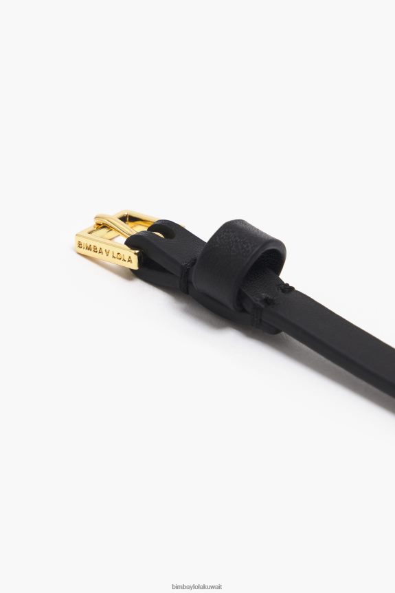سوار من الجلد باللون الاسود مع احرف لوجو معدني ذهبي. موديل بحزام طول رفيع وقابل للتعديل وقفل بإبزيم.