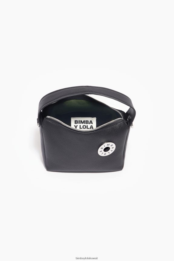 حقيبة كروس جلدية من الجلد الأسود. موديل هوبو متوسط مع قفل بسحاب وحزام شعار قابل للإزالة. تصميم خارجي مع شعار شيمو المعدني. 100٪ بوليستر معاد تدويره.
