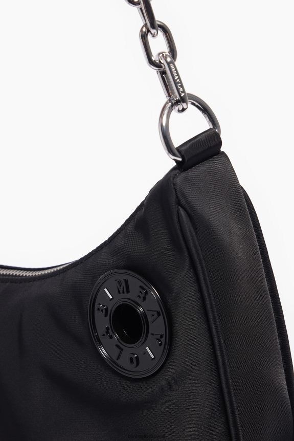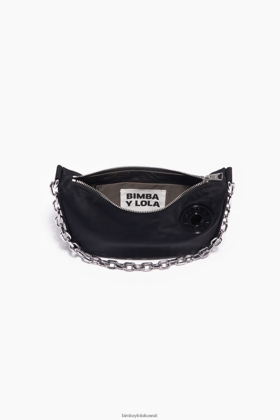 حقيبة كروس هاف مون نايلون باللون الأسود. نموذج صغير مع قفل بسحاب ومقبض سلسلة وحزام قابل للإزالة. تصميم خارجي مع شعار شيمو المينا. يحتوي هذا الطراز على 100٪ بوليستر معاد تدويره.