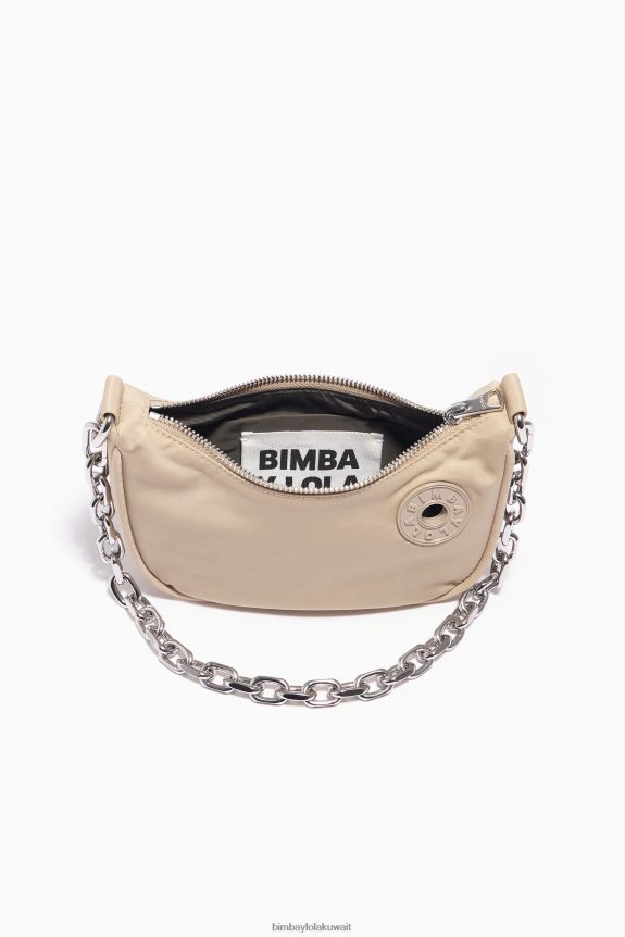 حقيبة كروس هاف مون نايلون باللون العاري. موديل صغير مع قفل بسحاب ومقبض سلسلة وحزام قابل للإزالة. تصميم خارجي مع شعار شيمو المينا. يحتوي هذا الطراز على 100٪ بوليستر معاد تدويره.