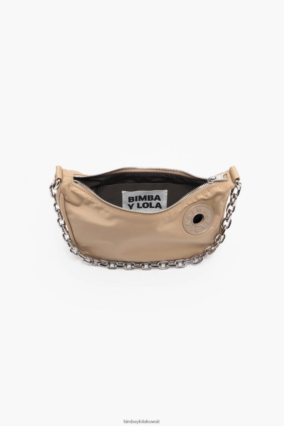 حقيبة كروس هاف مون نايلون باللون العاري. موديل صغير بقفل بسحاب ومقبض سلسلة وحزام شعار قابل للإزالة. تصميم خارجي مع شعار شيمو المينا.