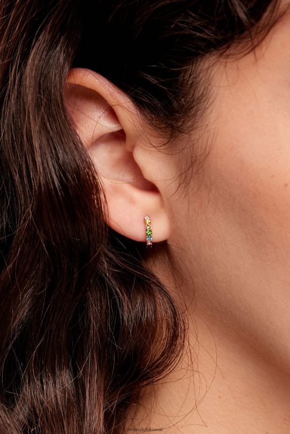 أقراط دائرية صغيرة ذهبية مرصعة بالكريستال متعدد الألوان. نموذج مخصص مع الشعار المحفور.