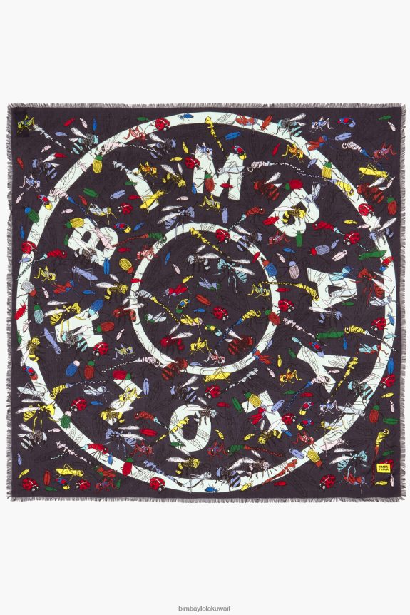 شال مربع مطبوع عليه حشرات مختلطة وشعار Xl على خلفية رمادية داكنة.