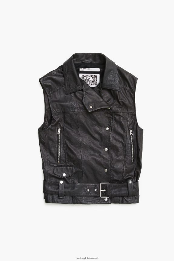سترة جلدية لراكبي الدراجات باللون الأسود. موديل بقصة مستقيمة ، بلا أكمام ، مع ياقة على شكل طية صدر لراكبي الدراجات. أزرار أمامية ، حزام نغمي وجيوب أمامية بسحاب.