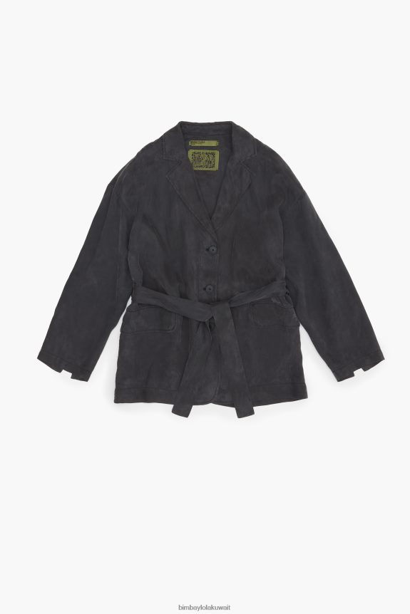جاكيت بليزر باللون الأسود المغسول. نموذج كبير الحجم ، ياقة طية صدر السترة وأكمام طويلة. قفل زر أمامي وحزام نغمي.