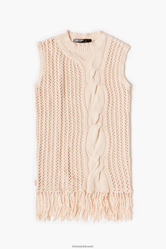 سترة متماسكة باللون البني الفاتح. نموذج بقصة مستقيمة ، بلا أكمام وياقة مستديرة. مخصصة بتفاصيل كابل مركزي وحافة مهدبة.
