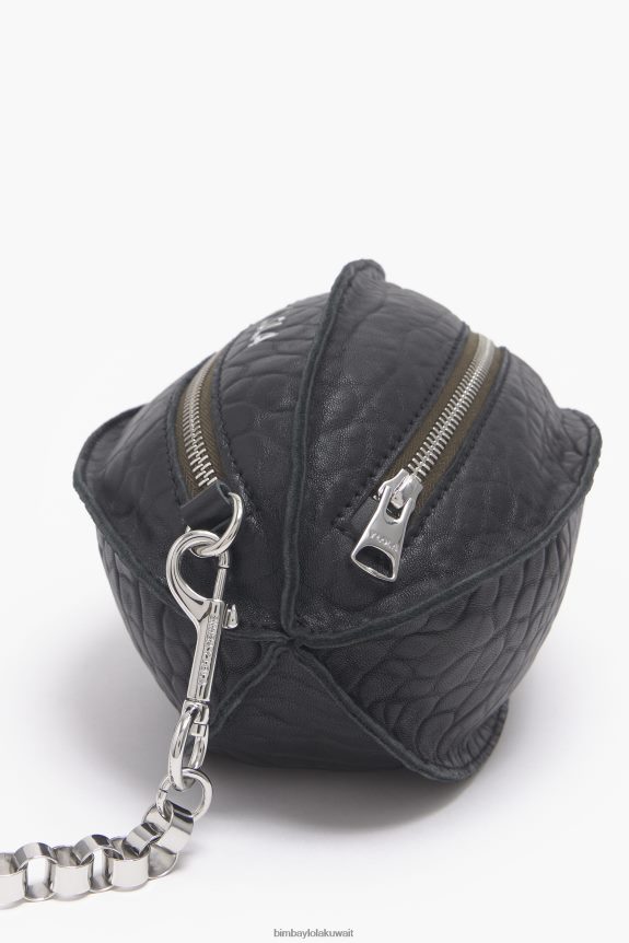 حقيبة كروس جلدية سوداء اللون على شكل كرة. نموذج صغير مع قفل بسحاب وحزام سلسلة. تصميم خارجي مع شعار معدني.