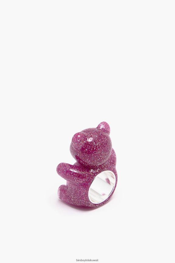 خاتم بتصميم دمية دب من الراتنج اللامع باللون الوردي مع كريستالات وقاعدة فضية.