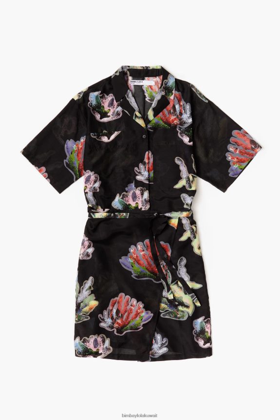 فستان قصير مع طبعة مرجانية باللون الرمادي. موديل مع ياقة قميص وأكمام قصيرة.
