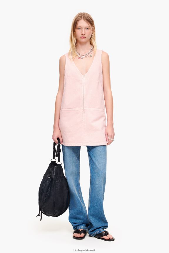 فستان قصير من الدنيم باللون الوردي الفاتح. نموذج من الدنيم مع أحزمة وفتحة رقبة على شكل V وقفل بسحاب.