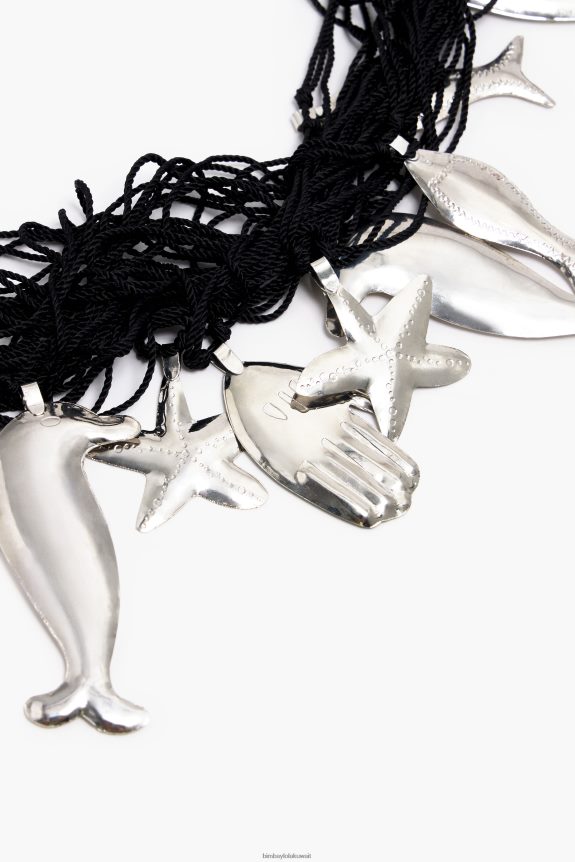 عقد طويل بحبال سوداء وقطع معدنية على شكل سمكة ويد ونجمة ودلفين من الفضة.