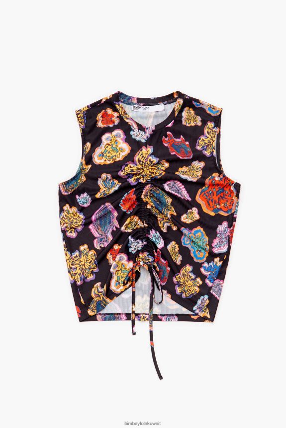 تي شيرت أسود مضلع بطبعة بحر السمك. بلا أكمام ، موديل ياقة دائرية مع مقدمة مكشكشة قابلة للتعديل.