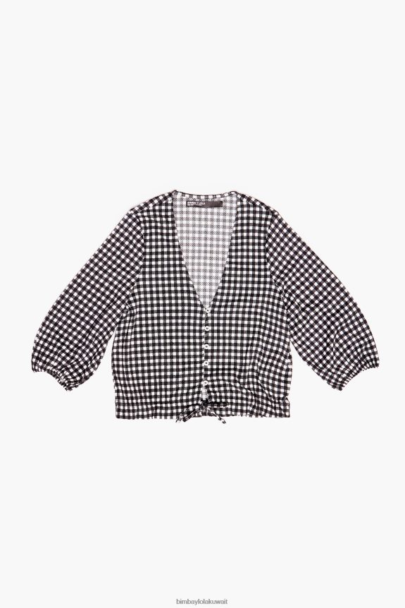 تي شيرت أسود كاروهات. نموذج بفتحة رقبة على شكل V وأكمام طويلة منفوخة مع مرونة وأزرار أمامية وحافة مع رباط.