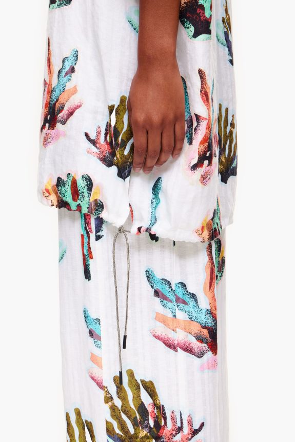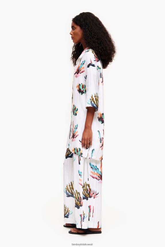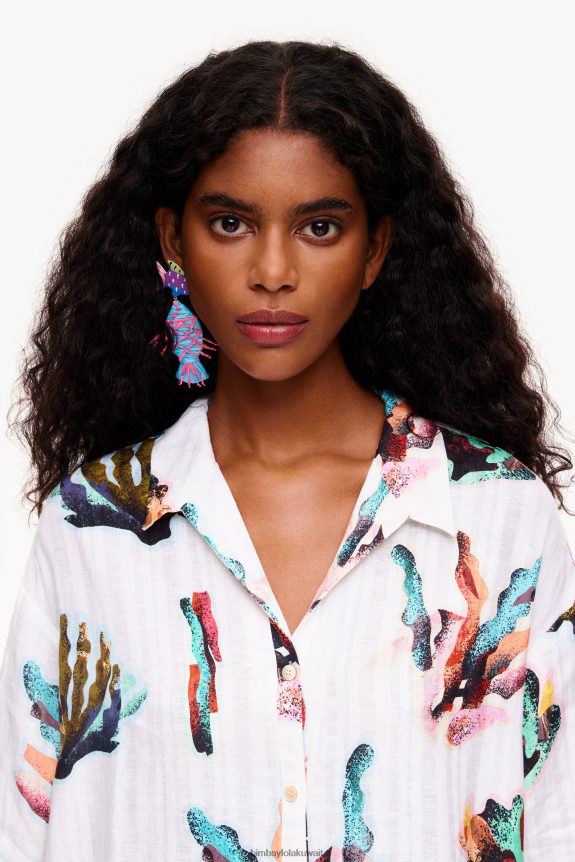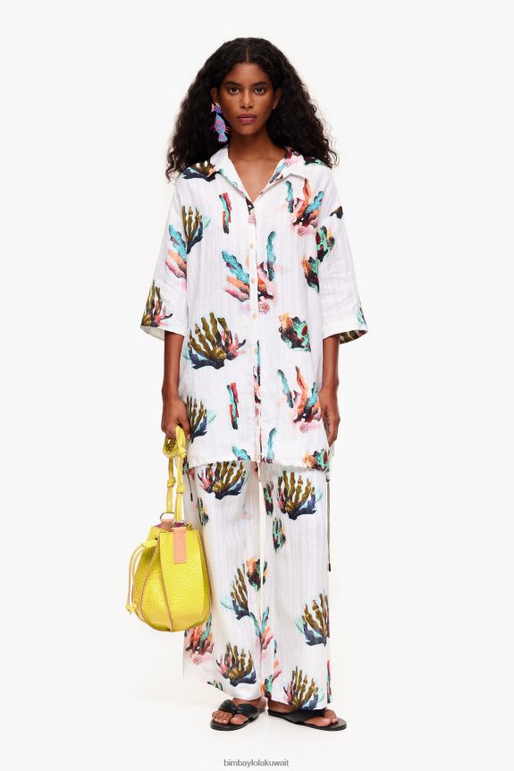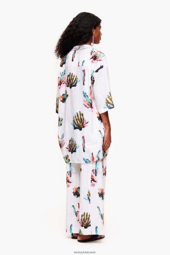 قميص طويل بطبعة مرجانية عاجية. موديل كبير الحجم وياقة قميص وأكمام قصيرة وواسعة. أزرار أمامية وربطات عنق على الجانبين.