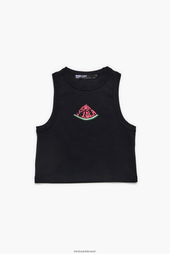 قمة سوداء. موديل قصير بلا أكمام برقبة مستديرة وشعار بيمبا بطيخي على الصدر.