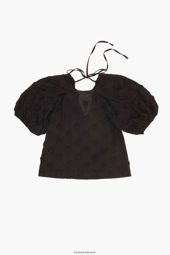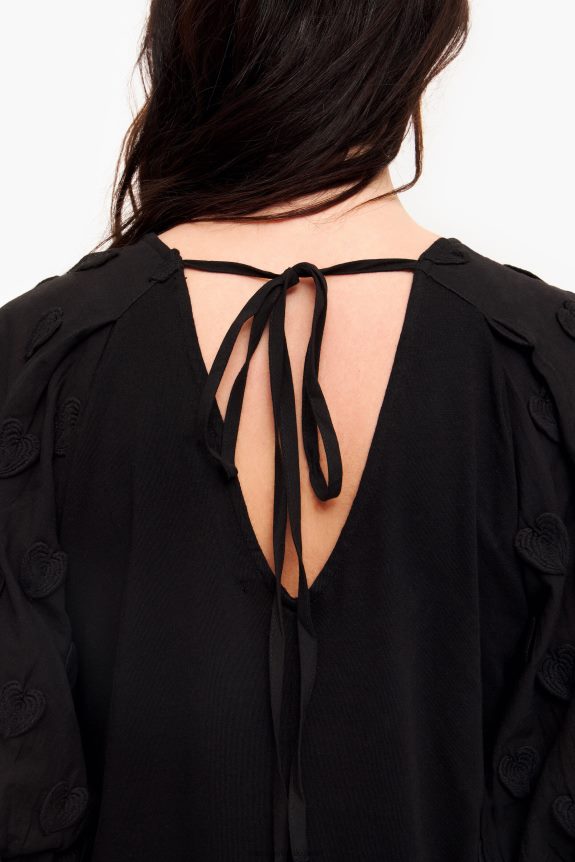 تي شيرت من القماش المزدوج باللون الأسود. موديل بقلوب مطرزة من الأمام ، وظهر منسوج جيرسي سادة ، وياقة مستديرة وأكمام قصيرة منفوخة.