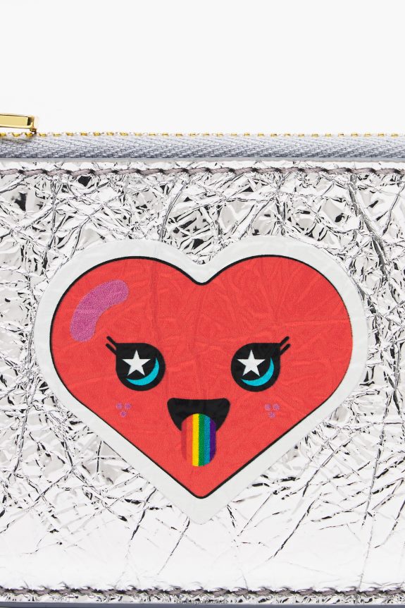محفظة جلدية مستطيلة من الفضة. نموذج مع قفل بسحاب وسحب معدني. الجزء الخارجي مع حاملات بطاقات متعددة ومخصص بشعار مطبوع ورموز تعبيرية. يحتوي هذا الطراز على 100٪ بوليستر معاد تدويره.