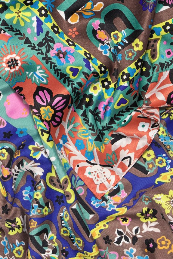 وشاح مربع مع طباعة زهور متعددة الألوان وشعارات على خلفية هندسية رمادية داكنة. يحتوي هذا الطراز على 100٪ بوليستر معاد تدويره.