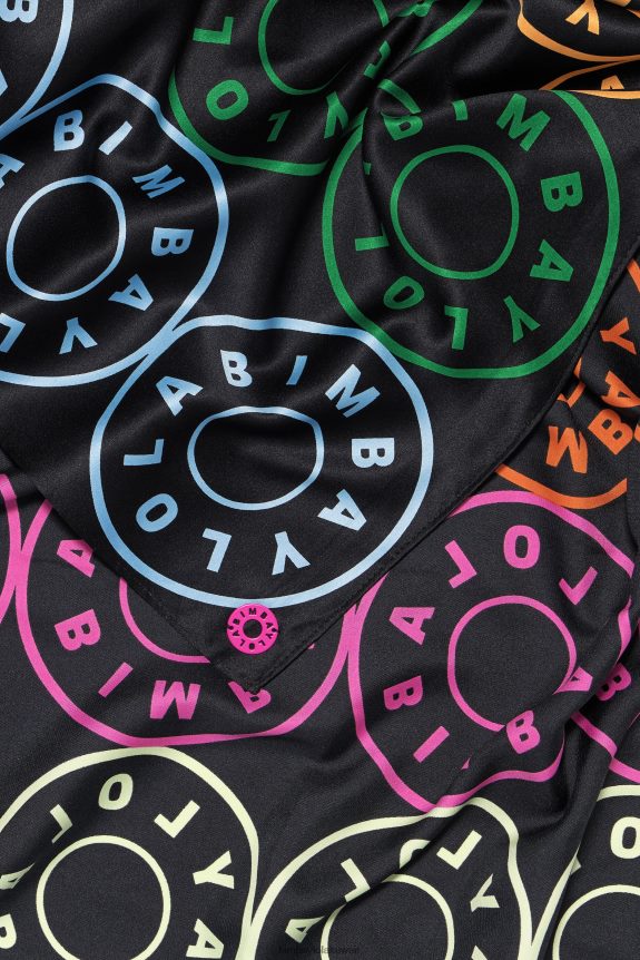 وشاح مربع مع شعارات متعددة الألوان مطبوعة على خلفية سوداء. يحتوي هذا الطراز على 100٪ بوليستر معاد تدويره.
