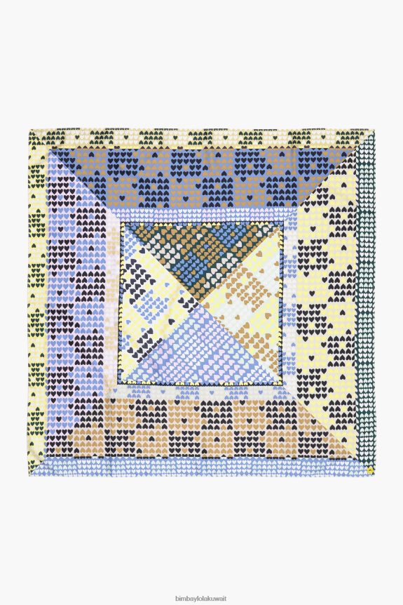 وشاح مربع مع قلوب صغيرة متعددة الألوان مطبوعة على خلفية هندسية.