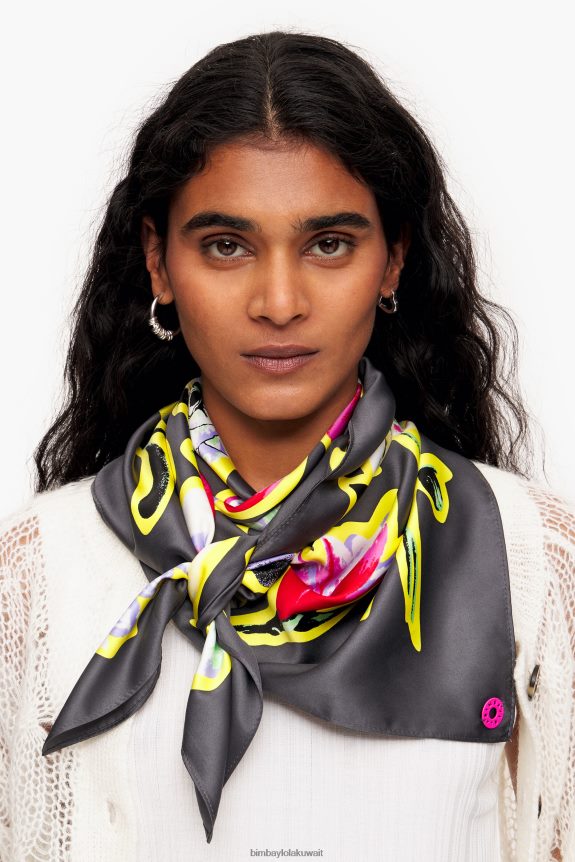 وشاح مربع مزين بطبعة الأزهار ومخطط XL متباين على خلفية رمادية داكنة. يحتوي هذا الطراز على 100٪ بوليستر معاد تدويره.