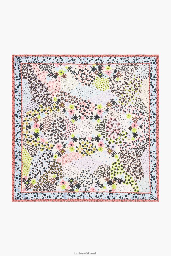 وشاح مربع مع طبعة زهور متعددة الألوان على خلفية بيضاء. يحتوي هذا الطراز على 100٪ بوليستر معاد تدويره.
