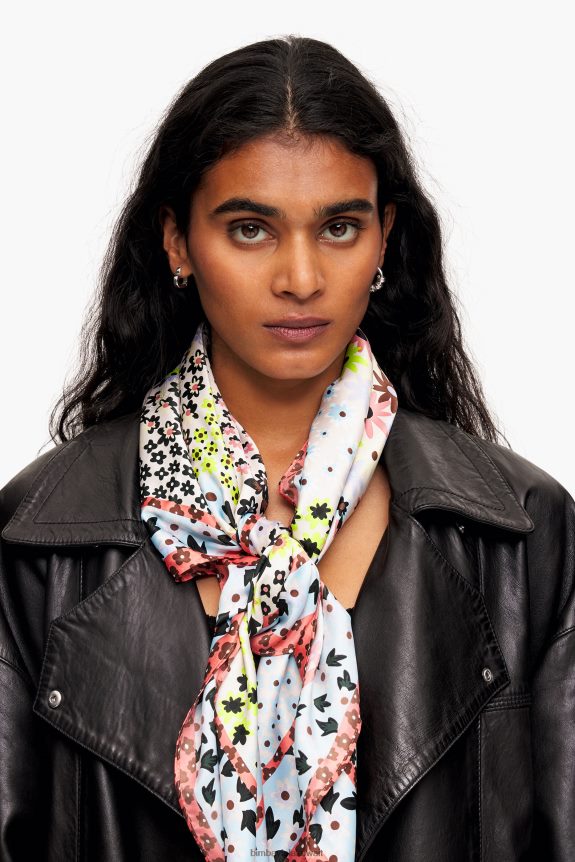 وشاح مربع مع طبعة زهور متعددة الألوان على خلفية بيضاء. يحتوي هذا الطراز على 100٪ بوليستر معاد تدويره.