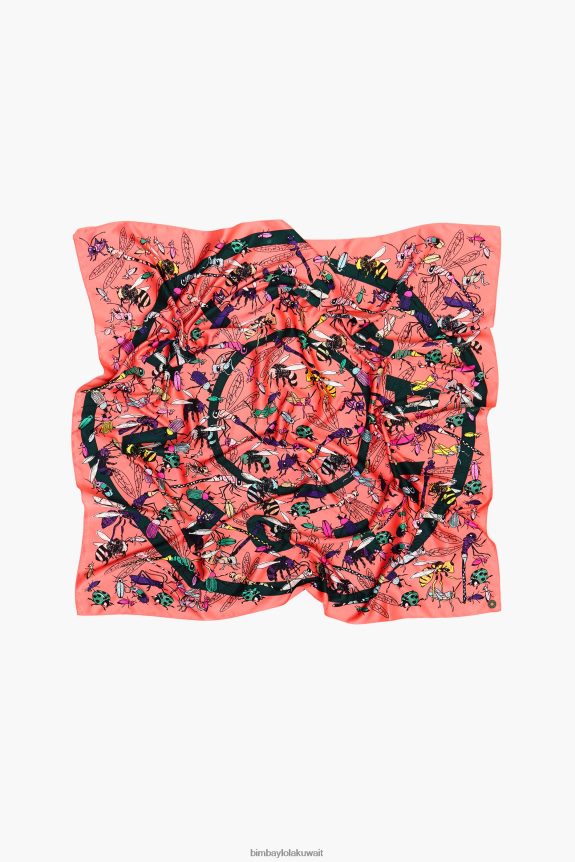 وشاح مربع مع طبعة حشرة مختلطة متعدد الألوان وشعار Xl على خلفية بلون مرجاني. يحتوي هذا الطراز على 100٪ بوليستر معاد تدويره.